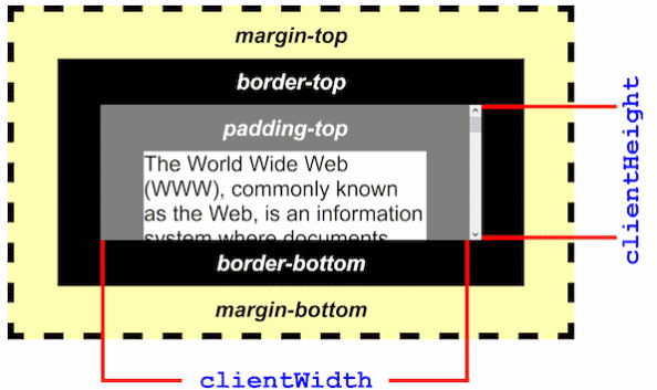完整內容高度 (scrollHeight) = 內容頂端與捲軸頂端的距離 (scrollTop) + 捲軸本身高度 (clientHeight) + 內容底端與捲軸底端的距離。