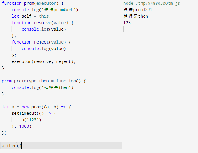 在then定義裡面,在實現、拒絕、擱置三種情況的區塊裡面,加入console.log,看看程式碼執行時怎麼跑的
